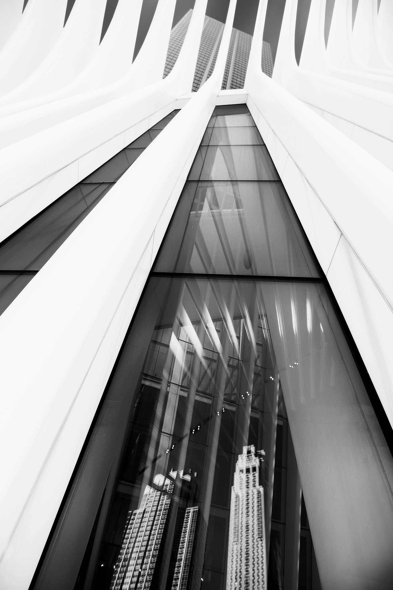 Oculus - 03 is a fine art photograph I created of the World Trade Center Oculus one of New York’s newest architectural gems. The Oculus was positioned as part of the World Trade Center masterplan by Daniel Libeskind and designed by Santiago Calatrava. The structure's orientation serves as a lasting reminder of the attacks of September 11, 2001. It is in alignment with the sun’s solar angles on each September 11, from 8:46 am, when the first plane struck, until 10:28 am, when the second tower collapsed. Its central skylight fits this alignment and washes the Oculus floor with a beam of light.